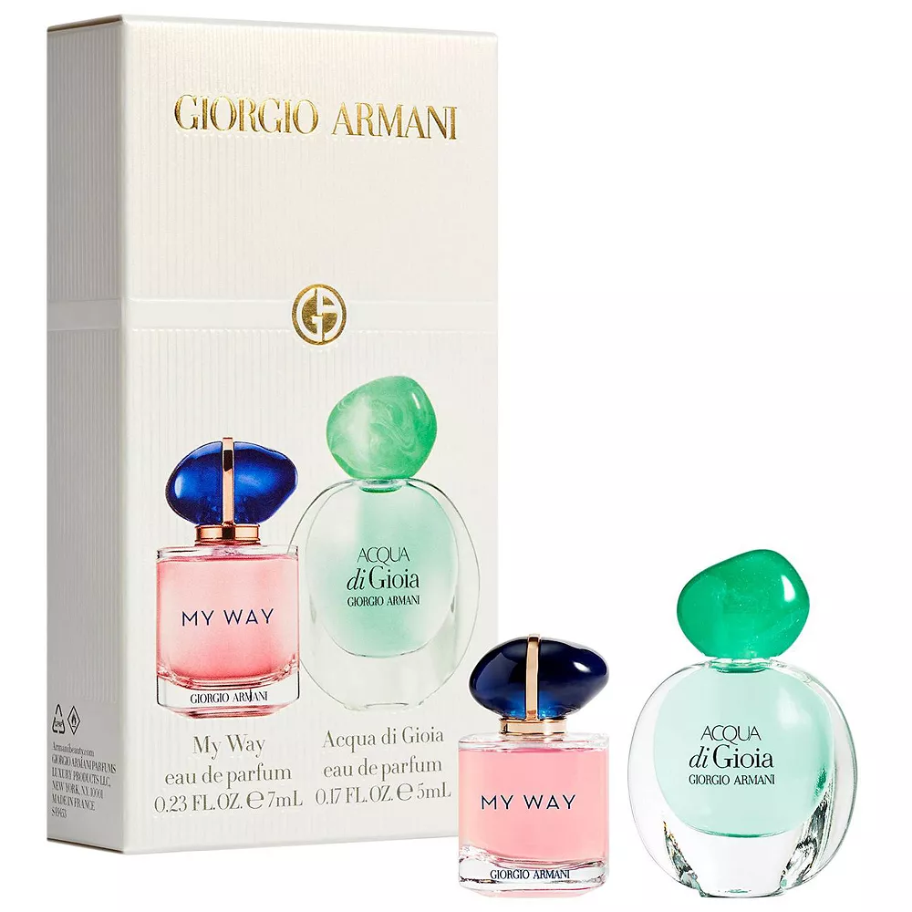 Set Description: Discover your next signature fragrance with this travel-size gift set featuring My Way Eau de Parfum, a feminine floral fragrance with a heart of orange blossom and tuberose atop a vanilla perfume base, and Acqua di Gioia, a refreshing women’s scent with a heart of gardenia and jasmine.