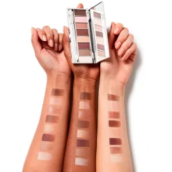 – 8 x 0.41 oz/ 12 g Eyeshadows in Jute Brown (dark grey brown with soft shimmer finish), Light shade from Strawberry Fudge duo (petal pink with gold shimmer), Dark shade from Strawberry Fudge duo (soft warm brown with shimmery finish), Dark shade from Day into Date duo (warm mahogany with matte finish ), Sahara Sun (golden apricot with super shimmer finish), Chocolate Covered Cherry (rich burgundy with matte finish), Dark shade from Ivory Bisque/Bronze Satin duo (light fawn with subtle shimmer), Lightest shade from Teddy Bear quad (classic ivory with matte finish)