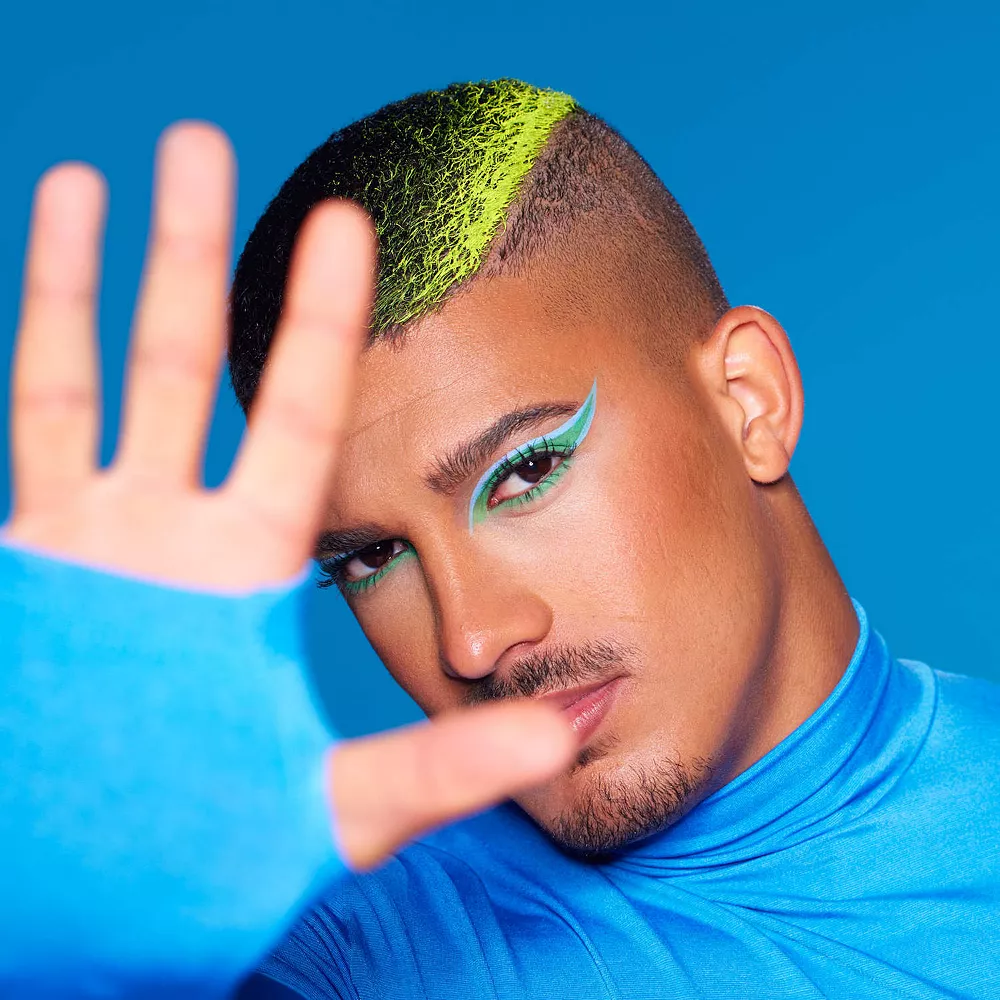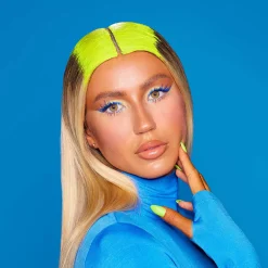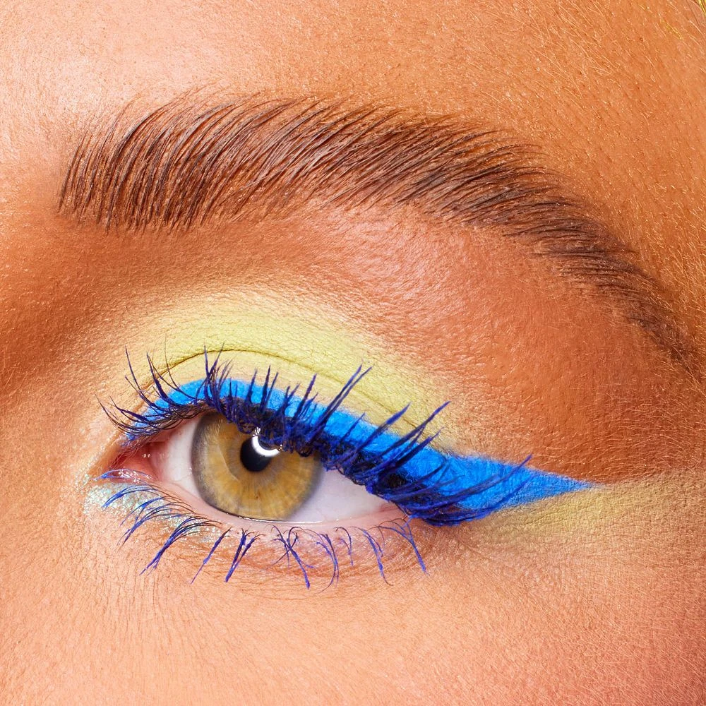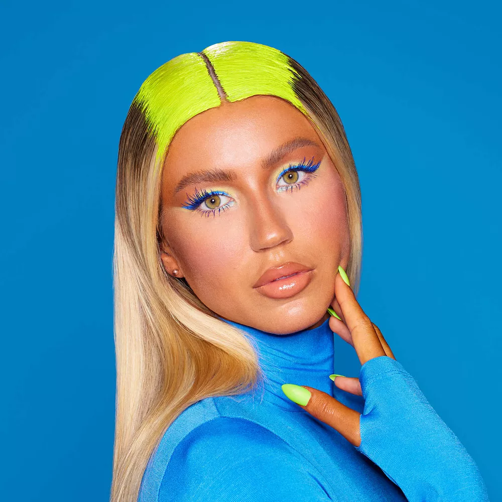 – 9 x 0.26/ 7.5 g eyeshadows in saturated shades of aqua blue, electric green, and neon navy