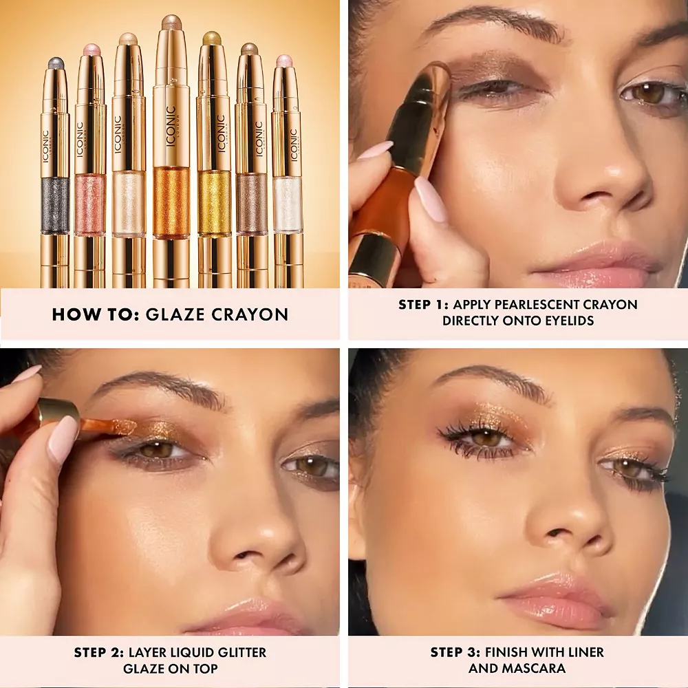 What Else You Need to Know: Iconic London wanted to create a product that was quick and easy to use but still delivered that iconic ultra-glam payoff. Enter Glaze Crayon: your new glistening, sultry-eyed best friend. One end houses a silky eyeshadow crayon that can be blended over the eyelid for a captivating wash of metallic color. At the other end, you’ll find the secret to getting that grown-up glitter’ glaze: an ultra-rich, non-sticky glitter gel, perfect for creating that sparkling, wet-looking glaze effect.