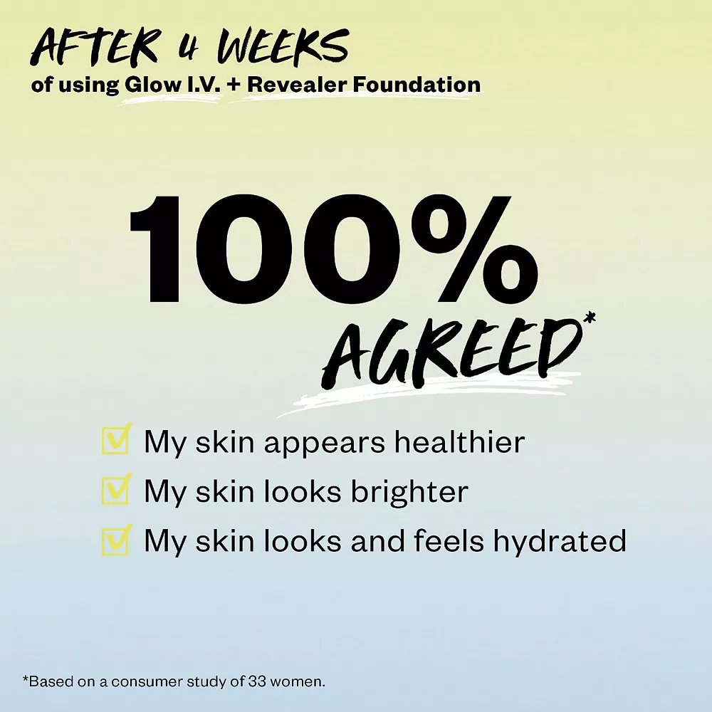 Clinical Results: Based on a consumer study of 33 women, after 4 weeks of using Glow I.V. + Revealer Foundation: