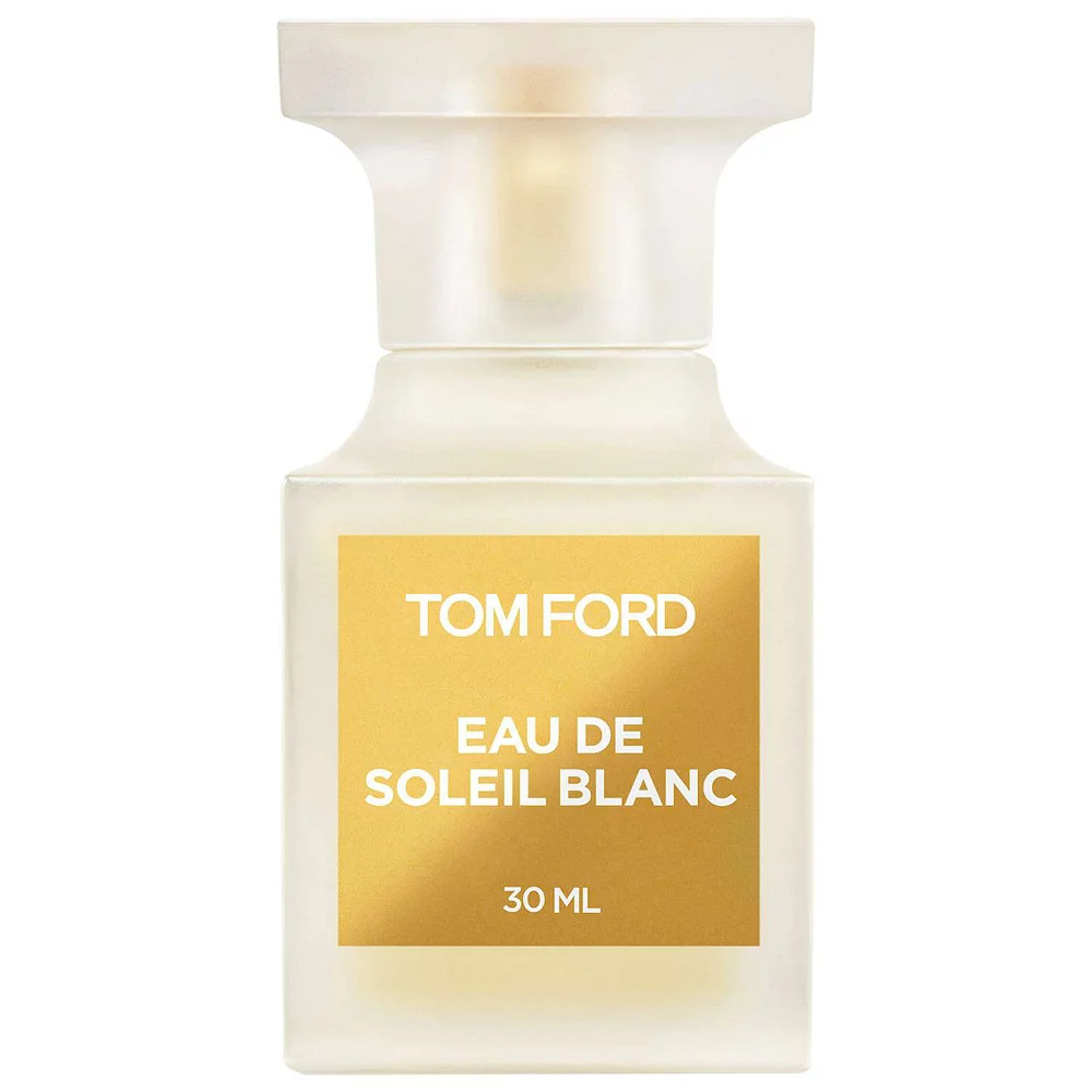 About the Bottle: Eau de Soleil Blanc is contained in a frosted-white Private Blend bottle. The 50 mL and 100 mL flacons have the sleek, architectural look of a chess piece with a glossy, gold-tone label and a gold-tone TOM FORD logo on the cap. The bottle is packaged in a white cross-hatched carton.